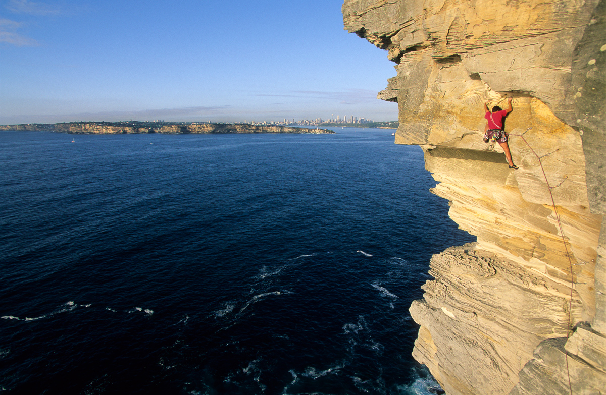 Greg James leading The Bolt Ladder (22) on North Head, with the harbour and Sydney city in the background.