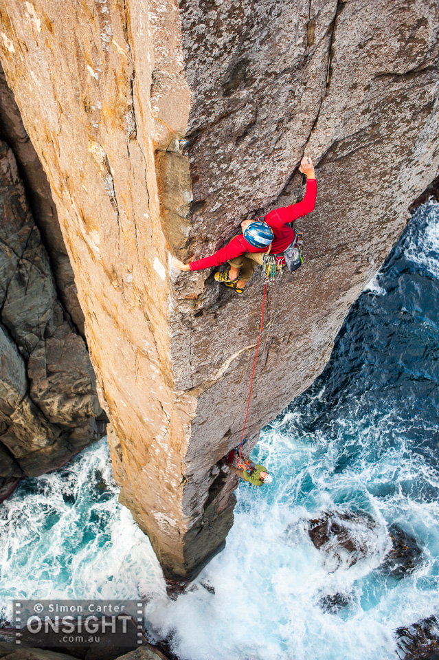 Doug McConnell leading, with Dean Rollins belaying, on The Ewbank Route (aka The Freed Route), which they freed at grade 27 in January 2009, on the 65 metre Totem Pole, at Cape Hauy, Tasmania, Australia.