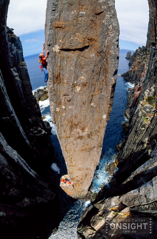 Monique Forestier leading pitch 2 of the Free Route (25) on the Totem Pole – an extraordinary 65-metre dolerite column at Cape Hauy, Tasmania, Australia.