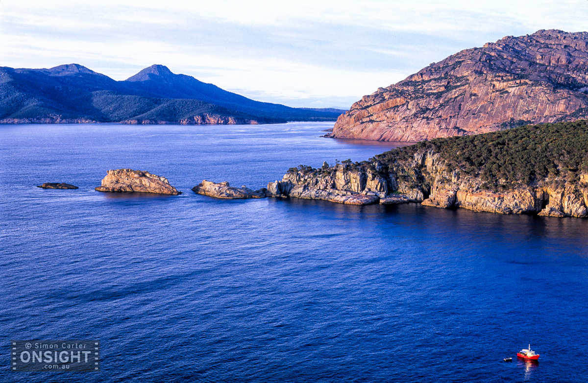 Looking along the east side of the Freycinet Peninsula, with the expansive slabs of The Hazards main wall visible in middle distance. Near the town of Coles Bay, Tasmania, Australia.