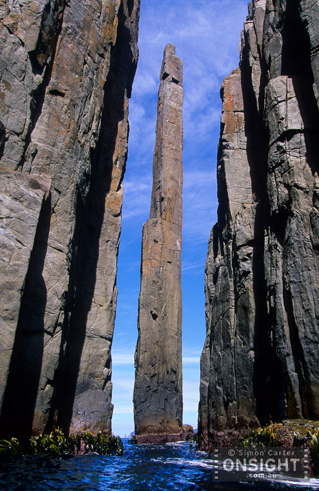 The 65 metre Totem Pole, with the mainland to its right and The Candlestick to its left. Cape Hauy, Tasman Peninsula, Tasmania, Australia.