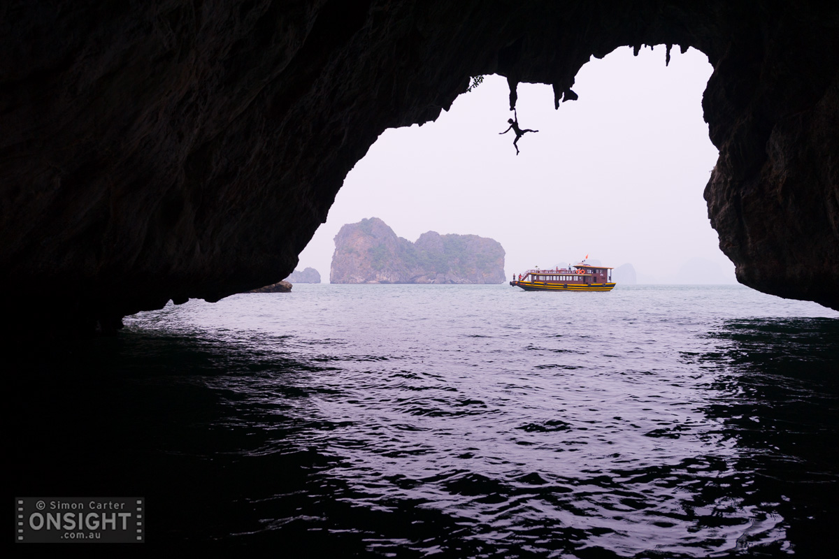 Monique Forestier tackles a hard and high “deep-water solo” out to a stalactite ten metres above the ocean, at Turtle Cave, Halong Bay, Vietnam.